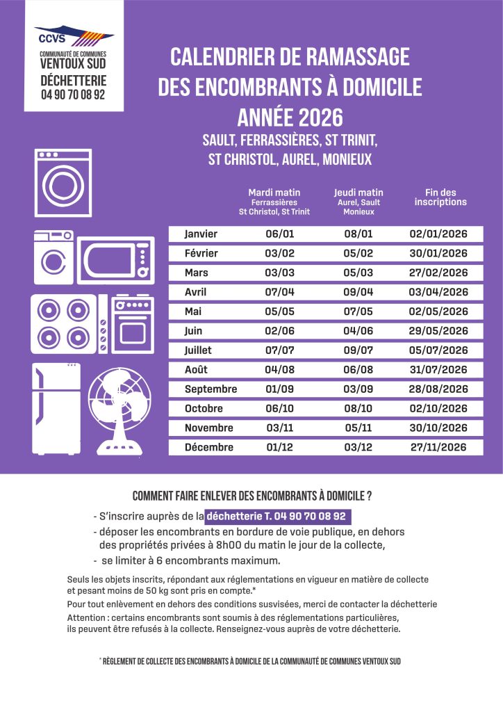 A compter du mois de juin 2017, la Communauté de Communes Ventoux Sud met en place une collecte des encombrants à domicile pour les particuliers uniquement. Pour bénéficier de cette collecte à domicile, il faut s’inscrire auprès de la déchetterie au 04.90.70.08.92 ou accueilmormoiron@ccvs84.fr