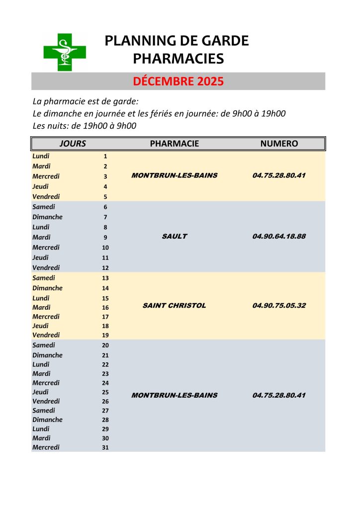Planning de garde des pharmacies – DÉCEMBRE 2025