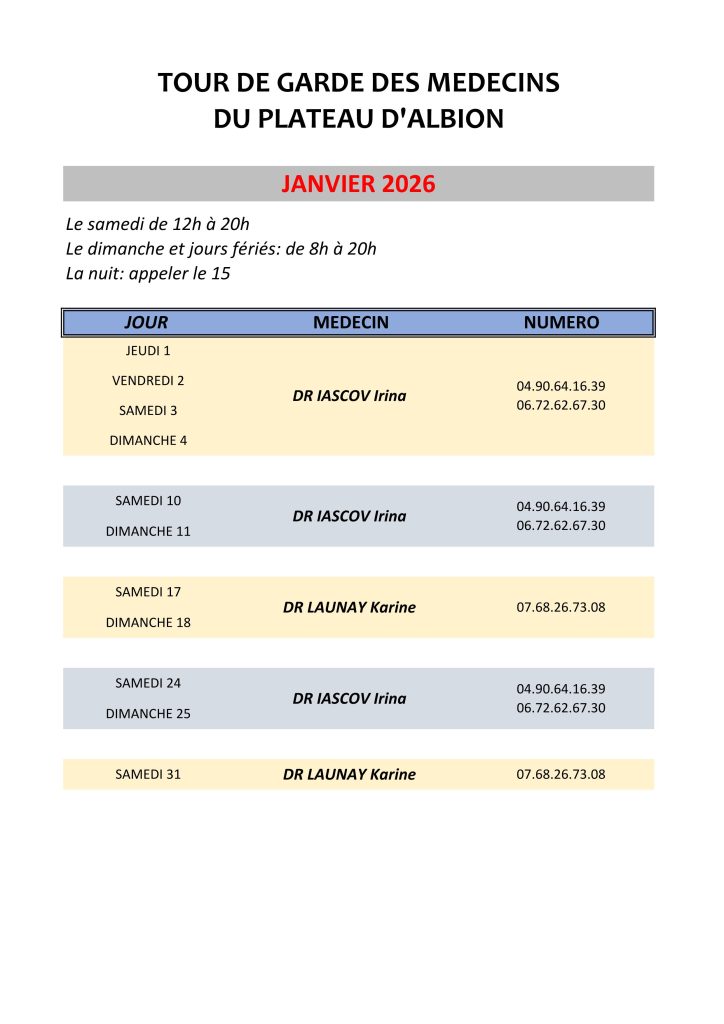 Tour de garde des médecins du plateau d’Albion – JANVIER 2026