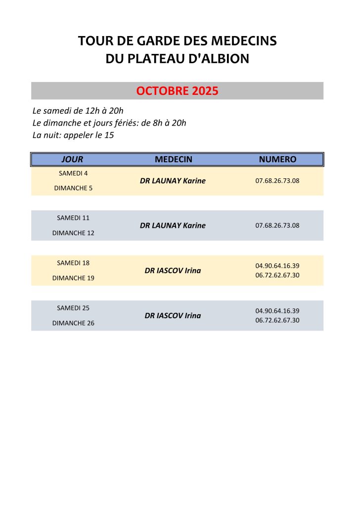 Tour de garde des médecins du Plateau d’Albion – OCTOBRE 2025